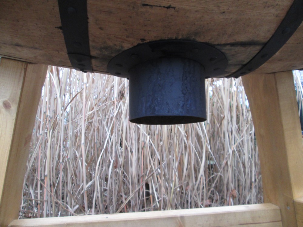 Väčšinou je na vrchole udiarne umiestnený komín, tam je ale v prípade udiarne zo suda umiestnené veko, ktorým sa vkladajú a vyberajú údeniny. Podobný princíp otvárania môžete vidieť napríklad pri plynových griloch. Ako si môžete všimnúť, vnútro veka rovnako ako zvyšok vnútrajška udiarne je sfarbený vínovú farbu od červeného vína, ktoré vo vnútri udiarne pôvodne zrelo. Veko je prirobené k súdu pánty a decentnou retiazkou, ktorá zabraňuje tomu, aby prepadlo na druhú stranu.