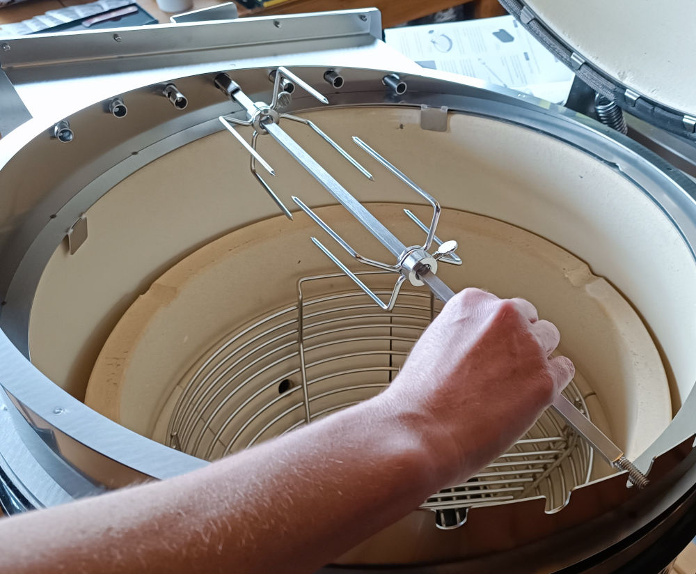 Nerezový prstenec rotisserie sa jednoducho nasadí na spodnú časť keramického grilu Monolith Classic. Užšou časťou musí byť smerovaný k pántom veka grilu tak, aby sa dal gril aj s rotisseriou pohodlne zavrieť.