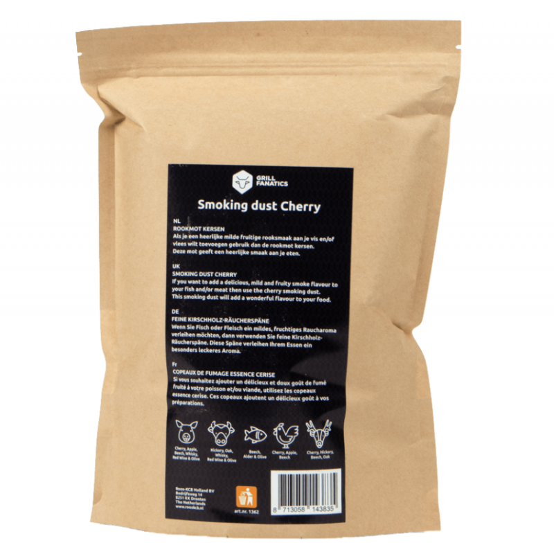 Čerešňové drevené piliny Grill Fanatics sú určené na dochutenie jedál pri údení a pomalom grilovaní. Vytvárajú jemnú ovocnú arómu, ktorá dodá mäsu aj syrom príjemnú sladkastú chuť. Sú vhodné najmä na kačicu, jahňacie, hovädzie a bravčové mäso, ale aj na syry. Piliny sa používajú ako náplň do generátora studeného dymu alebo do údiaceho boxu. Jedna dávka horí niekoľko hodín a zabezpečí rovnomerné údenie. Vďaka nim dosiahnete jemnú a vyváženú dymovú chuť.