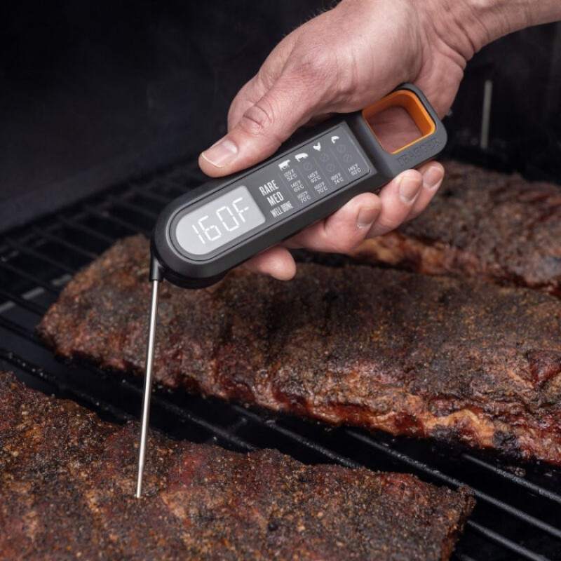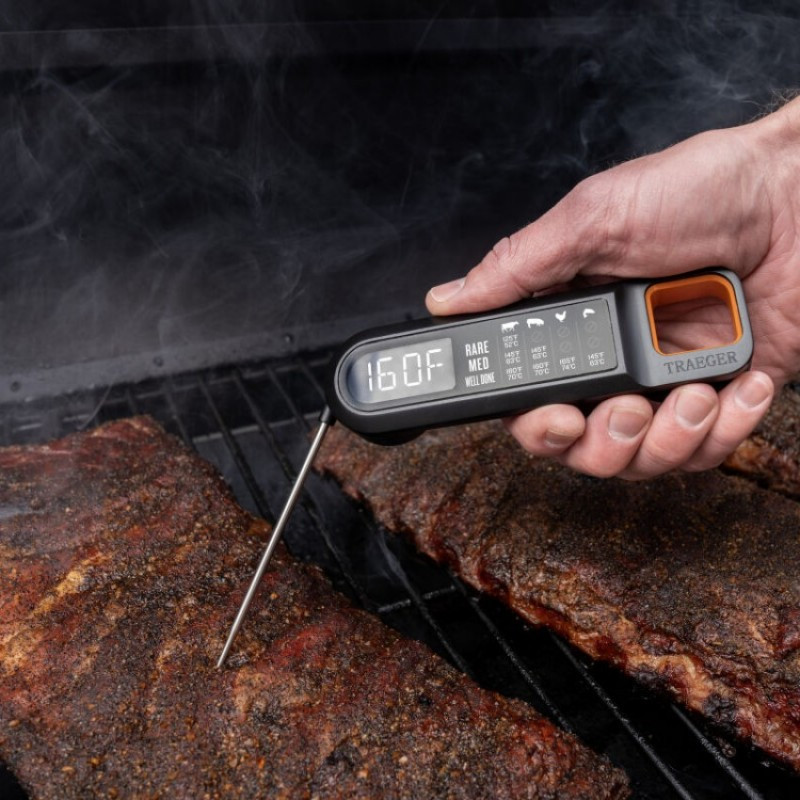 Digitálny teplomer Traeger na mäso s rýchlym meraním a LED displejom. Presné výsledky za pár sekúnd, skladacia sonda a vodeodolné prevedenie.