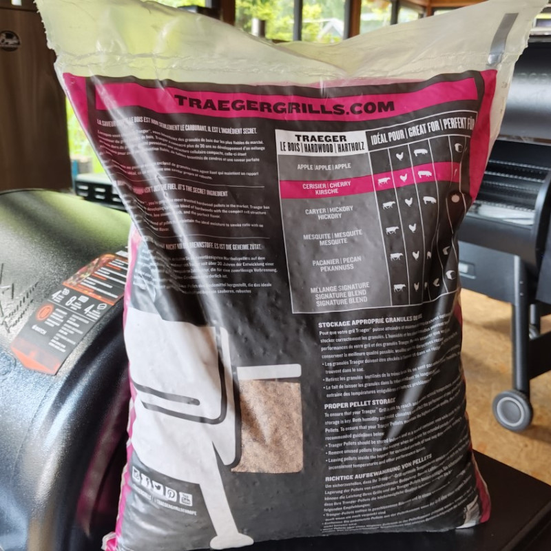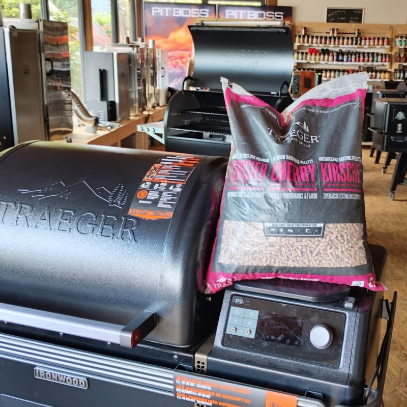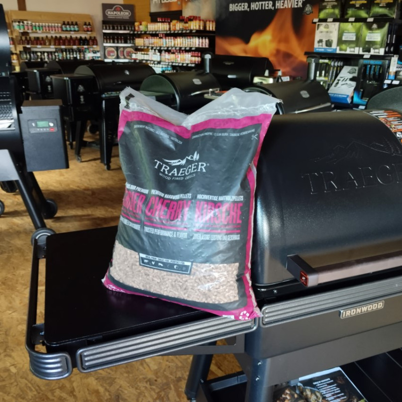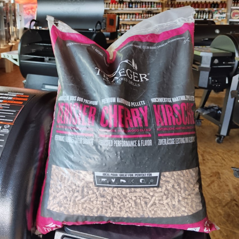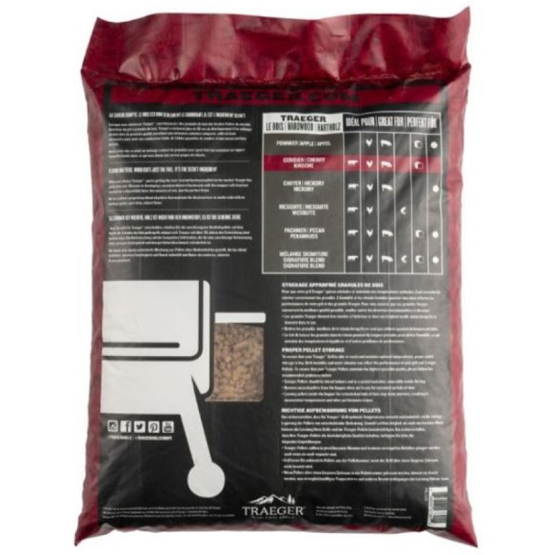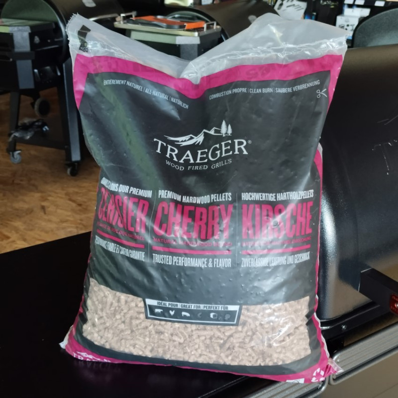 Pelety Traeger Čerešňa dodávajú grilovanému jedlu jemnú ovocnú arómu a prirodzenú dymovú chuť. Sú vhodné najmä na hovädzie, bravčové, hydinové alebo jahňacie mäso, ale výborne sa hodia aj na grilovanie pečiva a dezertov. Vyrábajú sa z tvrdých častí čerešňového dreva, ktoré pri spaľovaní produkujú čistý a stabilný dym. Zmes neobsahuje žiadne lepidlá, chemikálie ani umelé príchute. Vďaka tomu ide o prírodné a spoľahlivé palivo pre peletové grily, ktoré pomáha dosiahnuť autentickú chuť barbecue.