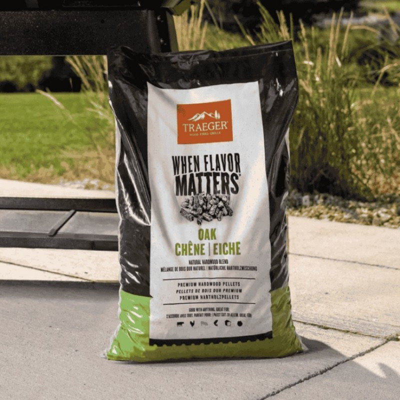 Drevené pelety Traeger Oak 9 kg z tvrdého dreva. Univerzálna dymová chuť s jemnými orieškovými tónmi pre mäso, ryby aj zeleninu.