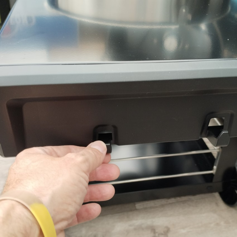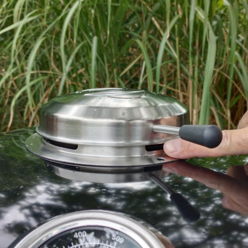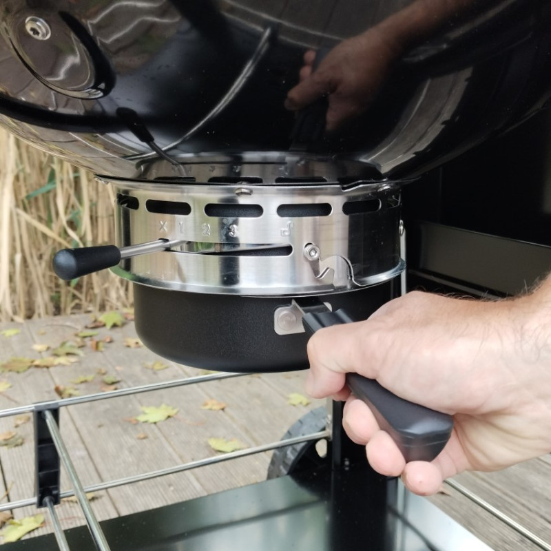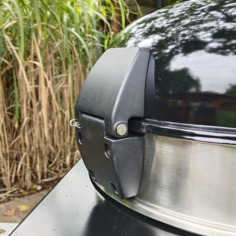 Vysoký poklop s integrovaným teplomerom umožňuje presnú kontrolu teploty a jednoduchý prechod medzi priamym a nepriamym grilovaním. Gril je usadený v pevnom vozíku s robustnými kolieskami a sklápacím bočným pultíkom, ktorý poslúži ako pracovná alebo odkladacia plocha. Veľký uzavretý zásobník na popol uľahčuje čistenie po grilovaní a zvyšuje komfort používania.