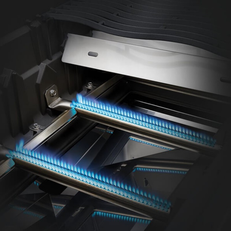 Tento gril je vhodný pre tých, ktorí chcú kombinovať rôzne techniky grilovania v jednom zariadení. Ponúka dostatok priestoru aj praktické riešenia pre komfortné používanie. Liatinový rošt WAVE udržiava stabilnú teplotu a vytvára typickú mriežku na mäse. Systém zapaľovania JET-FIRE umožňuje rýchle a spoľahlivé zapálenie horákov. Podsvietené ovládacie gombíky uľahčujú používanie grilu aj pri večernom grilovaní.