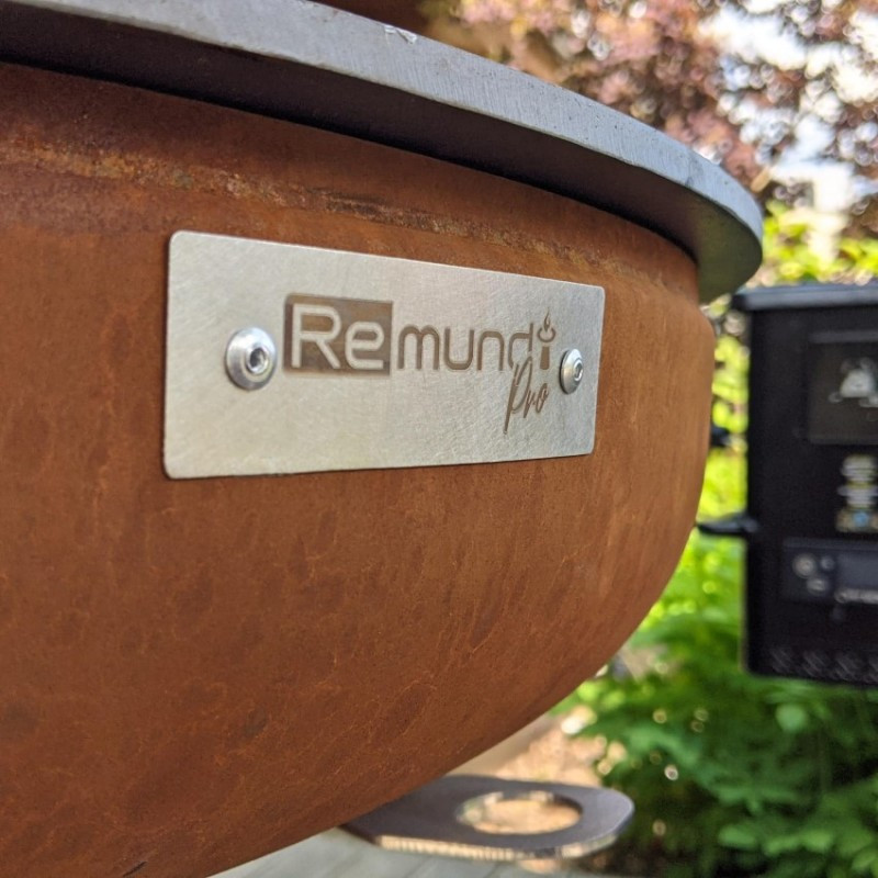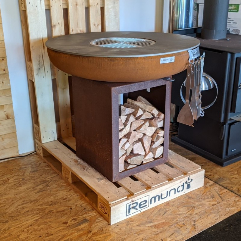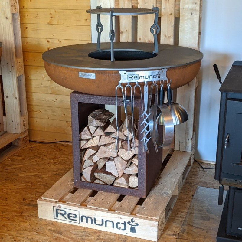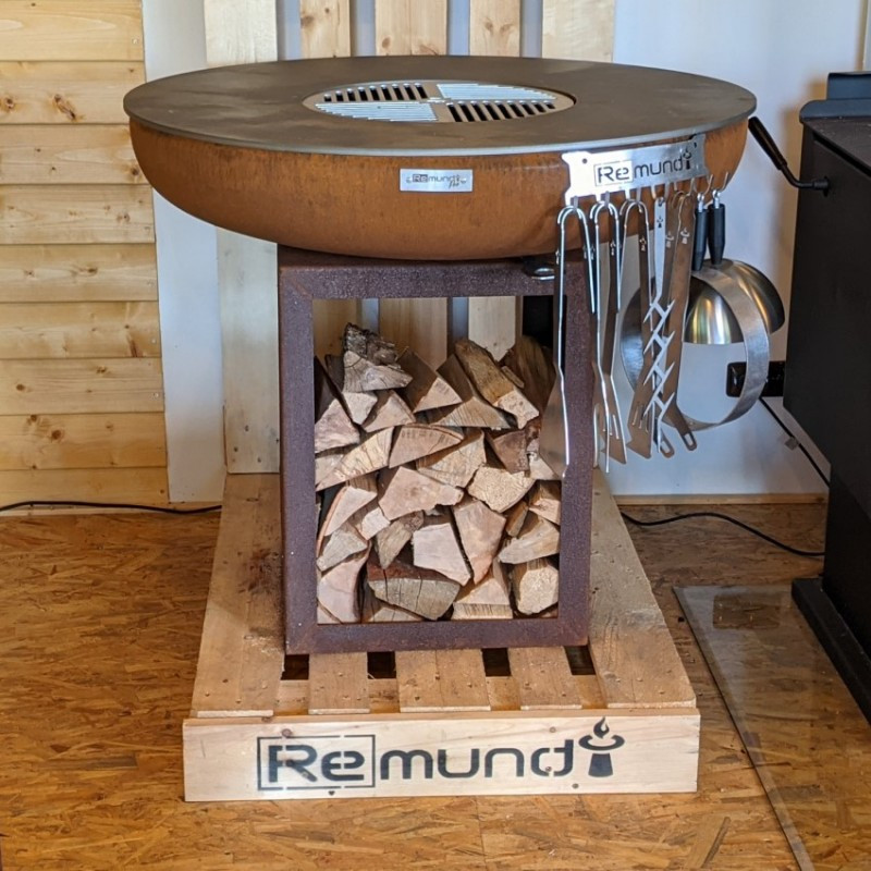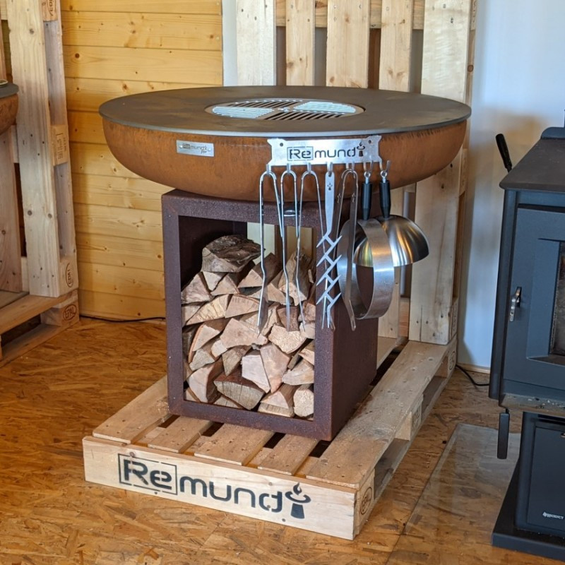 Robustné vonkajšie ohnisko Remundi Carus S s guľatou grilovacou platňou a zásobníkom na drevo pre celoročné grilovanie alebo len príjemné posedenie pri plápolajúcom ohni. Rustikálny dizajn zhrdzaveného kovu dokonale zapadne do vašej záhrady.