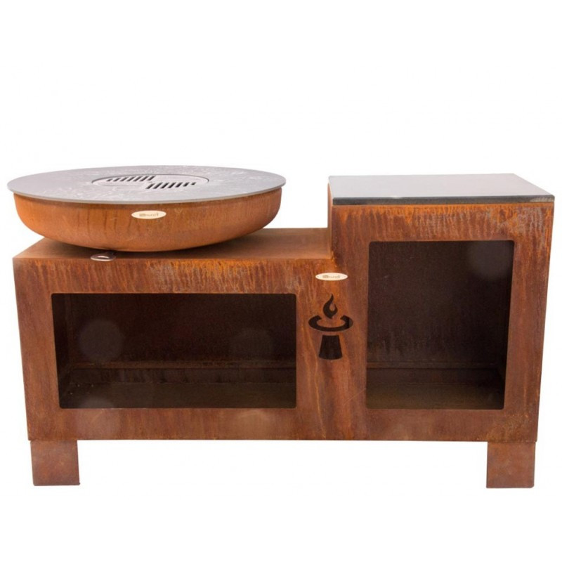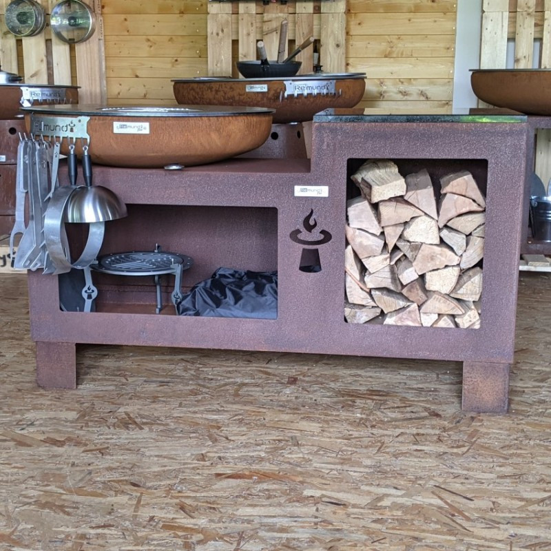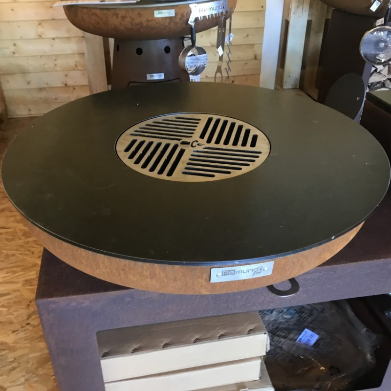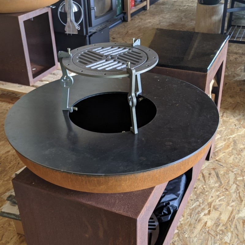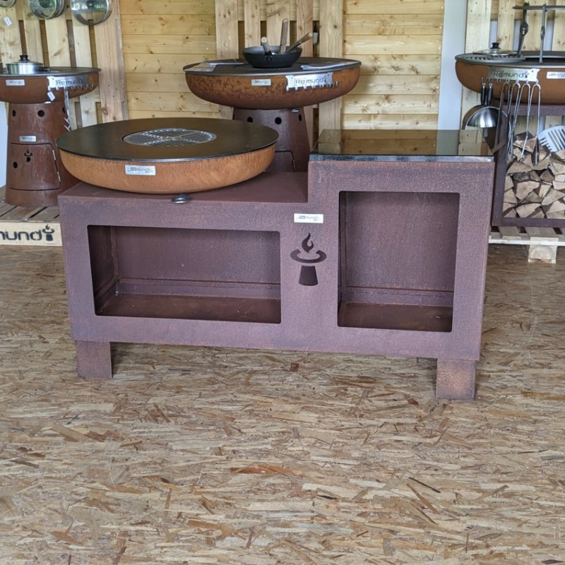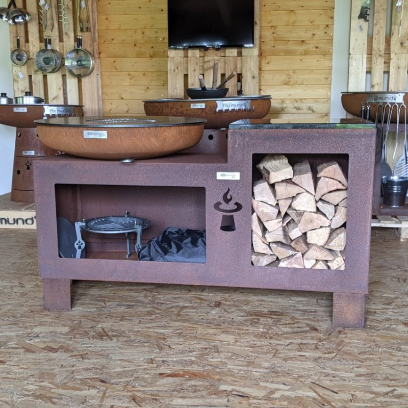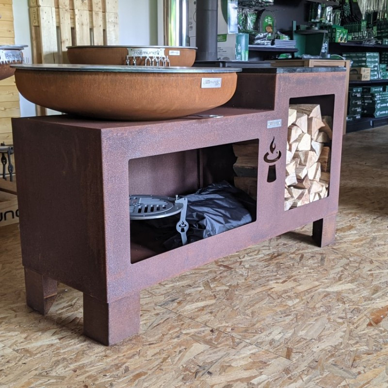 Robustné vonkajšie ohnisko Remundi s guľatou grilovacou platňou, praktickou pracovnou plochou a zásobníkom na drevo pre celoročné grilovanie alebo len príjemné posedenie pri plápolajúcom ohni.