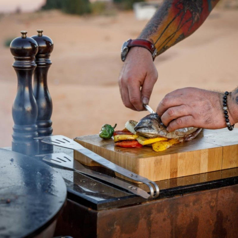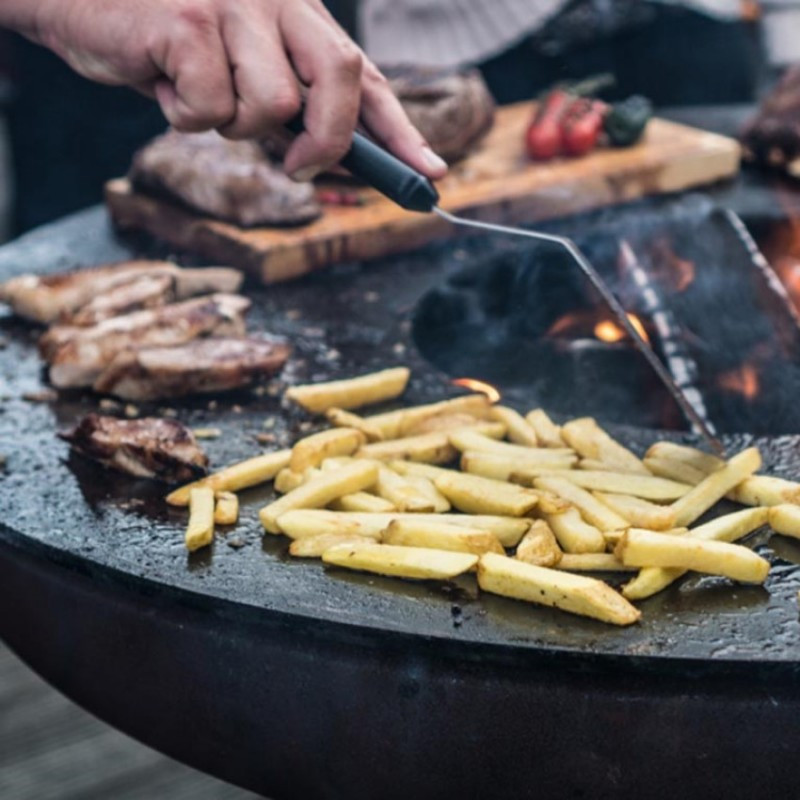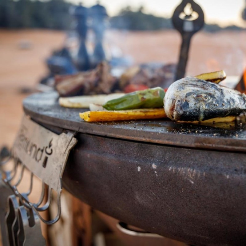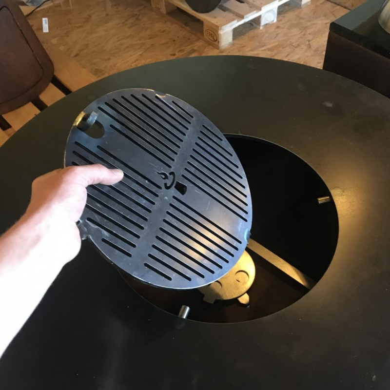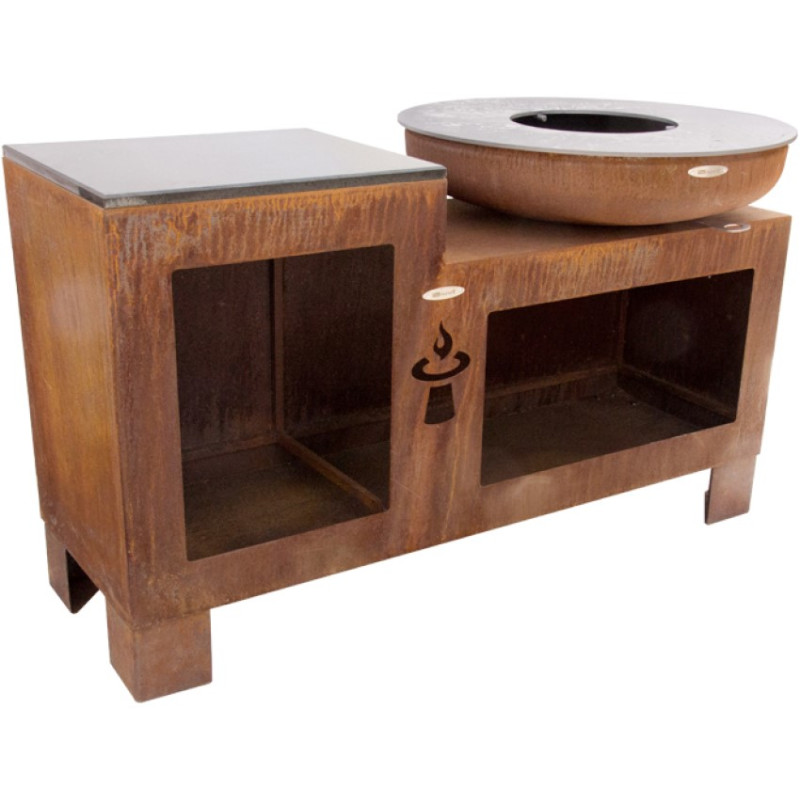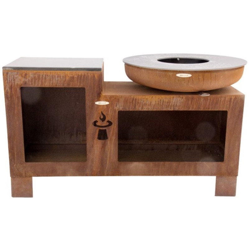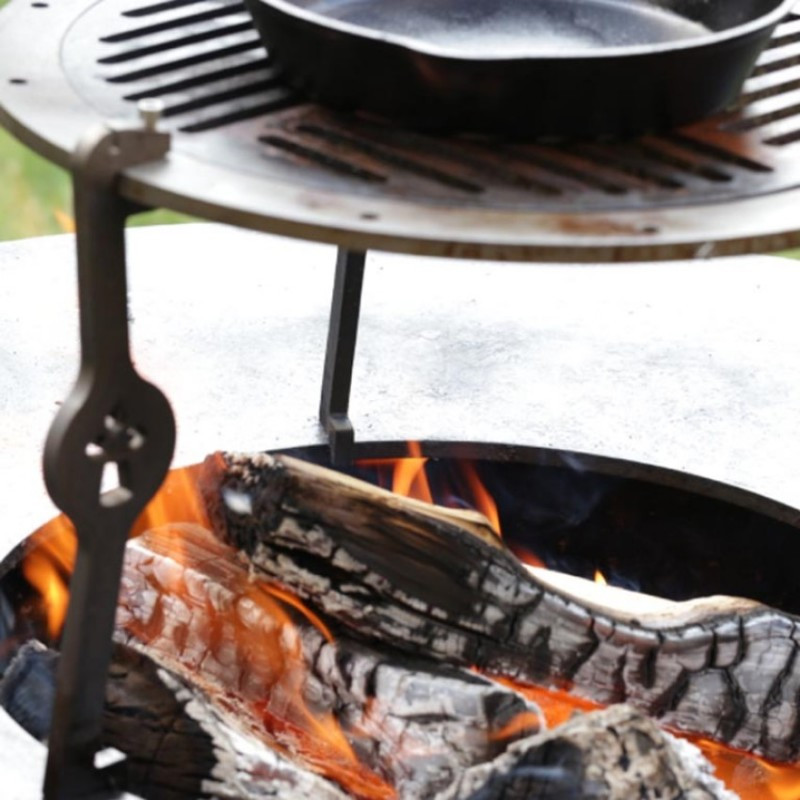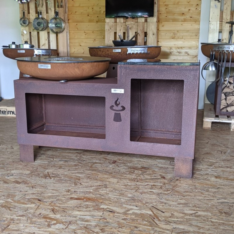 Robustné vonkajšie ohnisko Remundi s guľatou grilovacou platňou, praktickou pracovnou plochou a zásobníkom na drevo pre celoročné grilovanie alebo len príjemné posedenie pri plápolajúcom ohni.