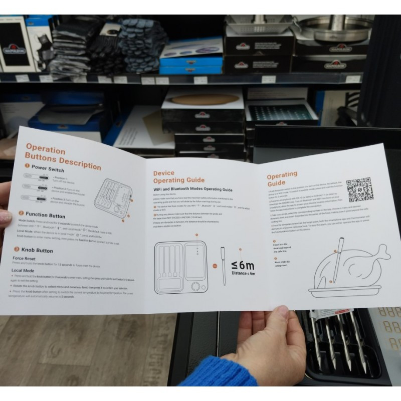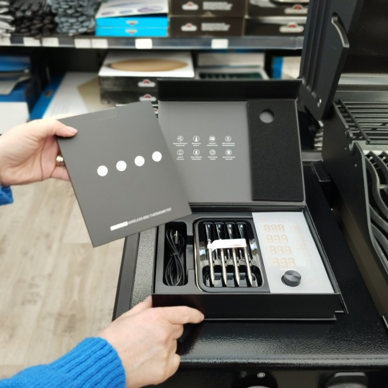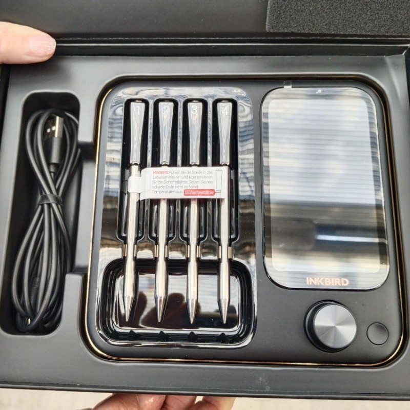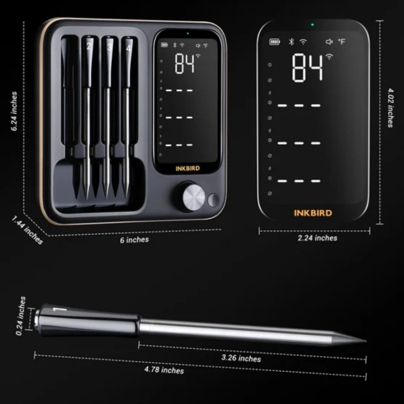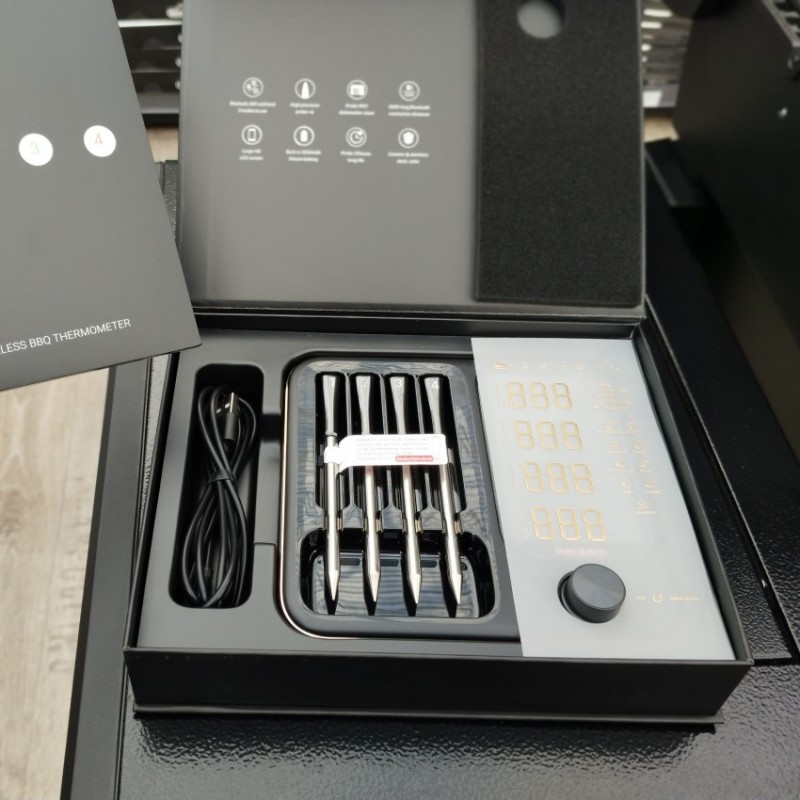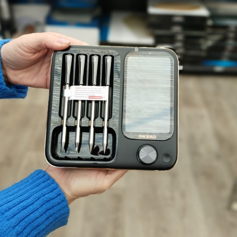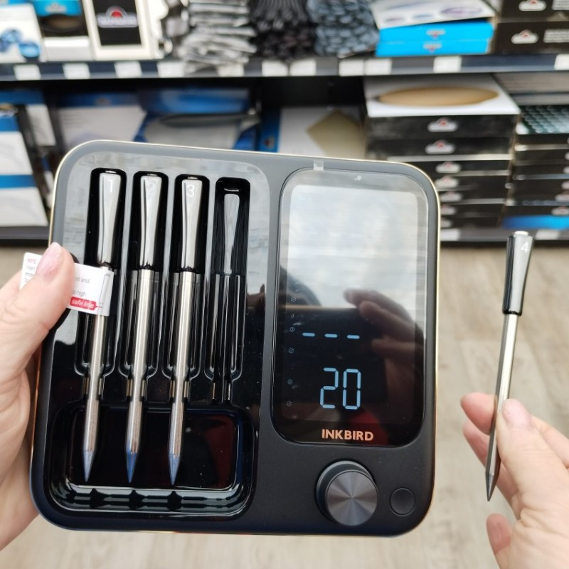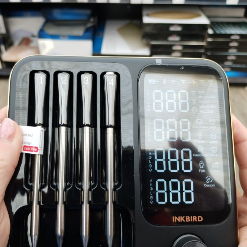 Štyri bezdrôtové sondy do mäsa INKBIRD s digitálnym panelom vhodné do grilu, pece aj do udiarne s dosahom až 90 m.
