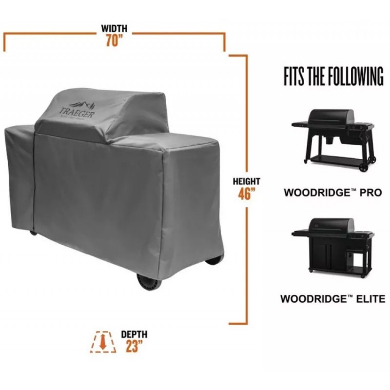 Ochranný obal Traeger Woodridge PRO a ELITE je praktickým riešením pre každého, kto chce svoj gril ochrániť pred nepriaznivým počasím. Vďaka pevnému spracovaniu spoľahlivo odoláva dažďu, vetru aj prachu počas celého roka. Materiál je navrhnutý tak, aby zvládal aj dlhodobé vystavenie slnečnému žiareniu a nízkym teplotám. Presný strih zaručuje perfektné prispôsobenie konkrétnym modelom grilov bez zbytočného voľného priestoru. Praktickým doplnkom je aj bočný zips pre jednoduché nasadenie, aj keď je bočná polica sklopená.