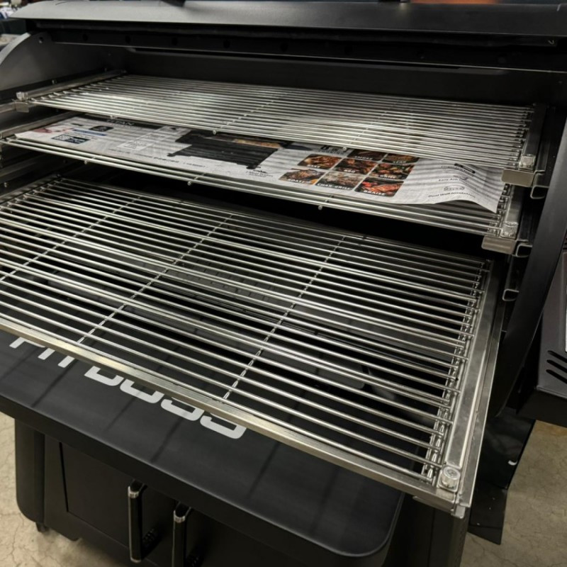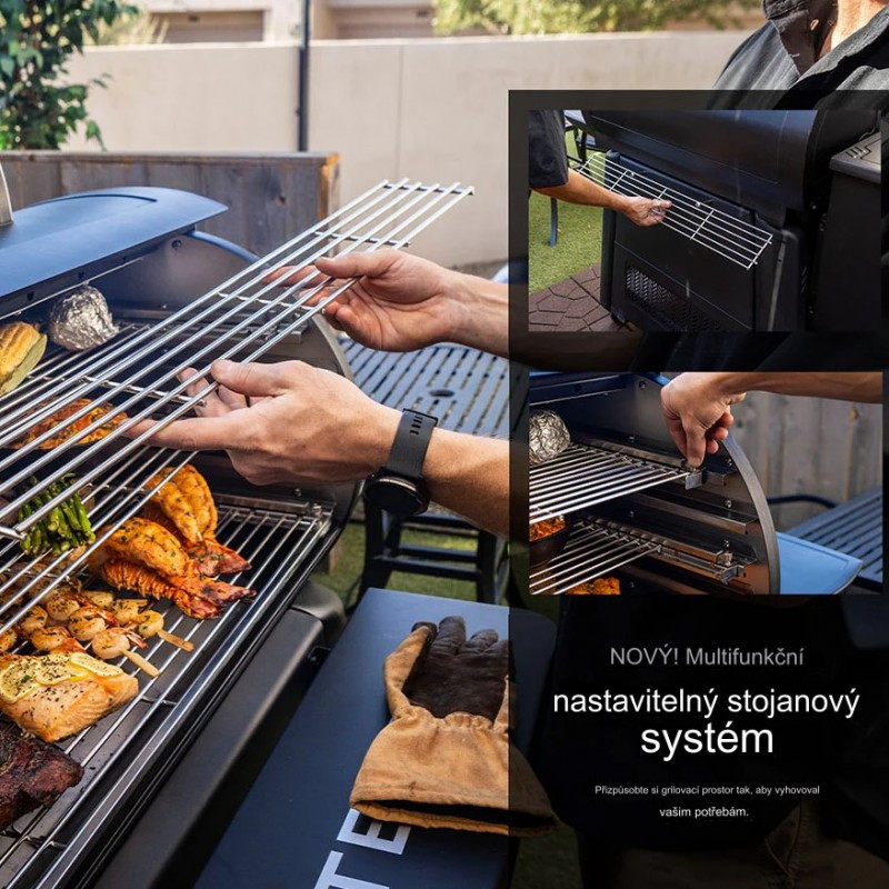 | Základné vybavenie | dotykový displej, automatický podávač a zapaľovač peliet, plech na odkvapový tuk, kýblik na tuk, hlavný nerezový rošt, stredný a vrchný rošt, predná sklopná polica, bočné police s háčikmi na nástroje, 2 sondy do mäsa |