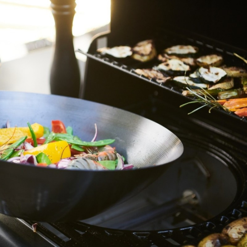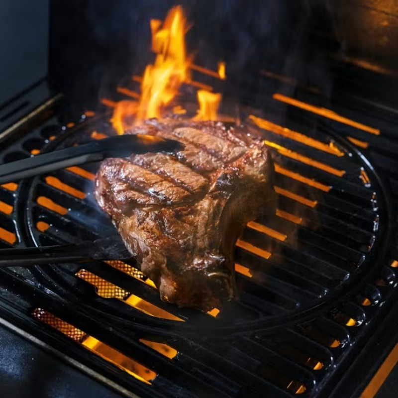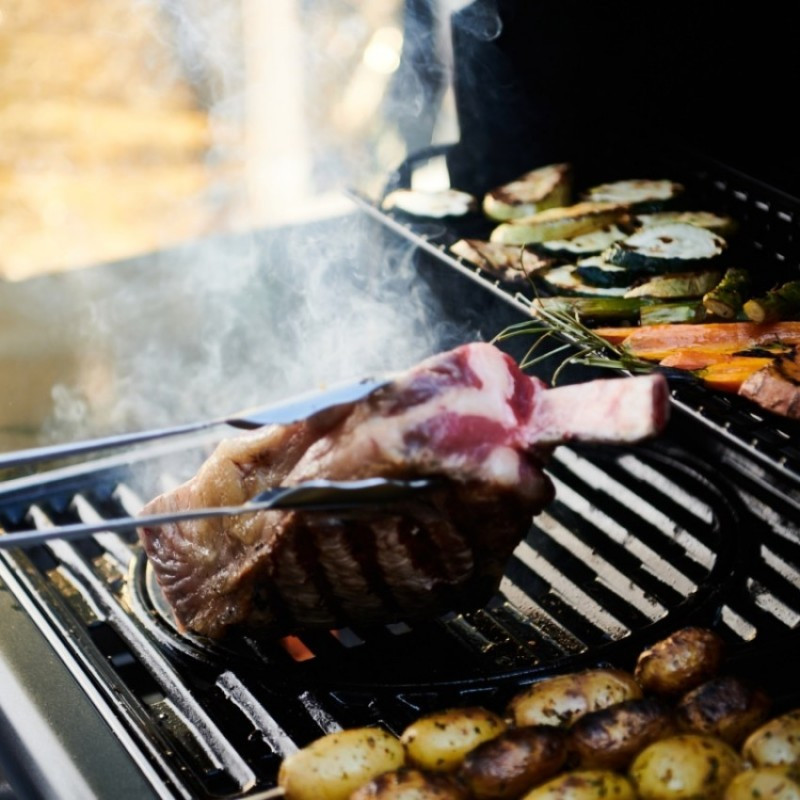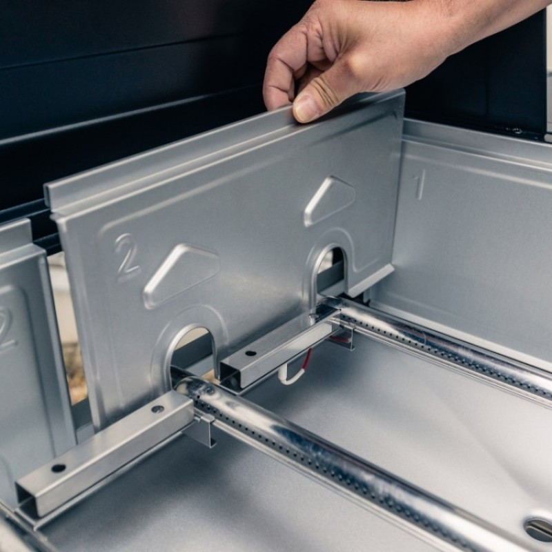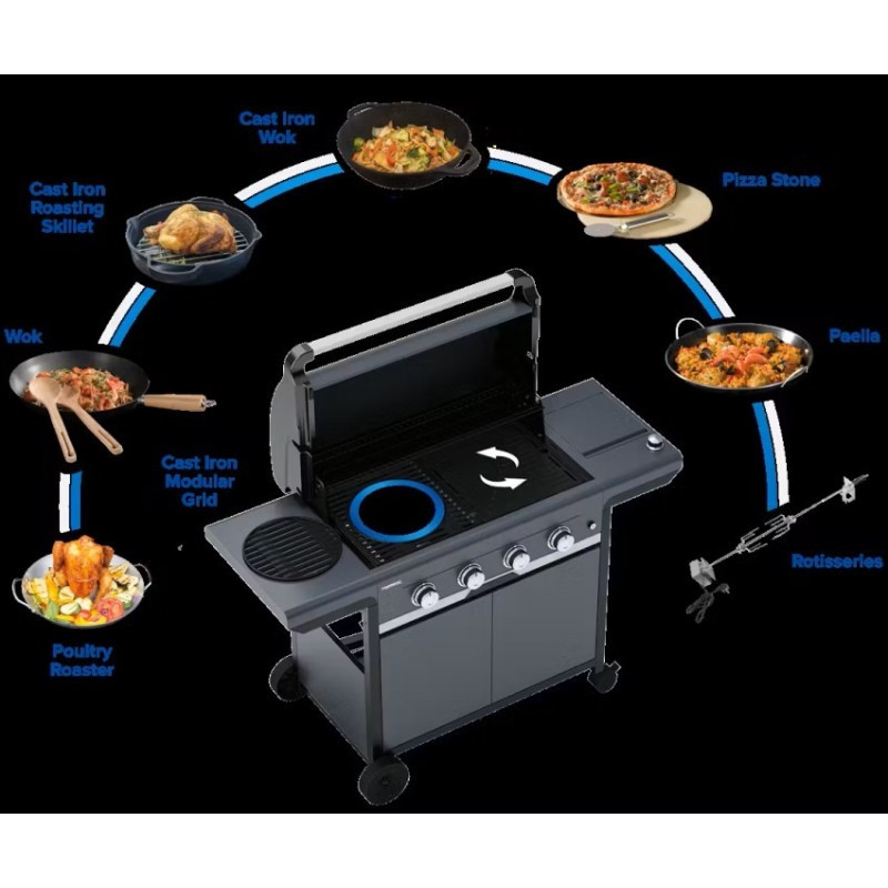 | Základné vybavenie | liatinový rošt Culinary Modular, tál, teplomer s budíkom, 2 bočné stolíky, 4× trubicové horáky z nerezovej ocele, bočný varič, čistiaci systém InstaClean, systém Searing Boost |