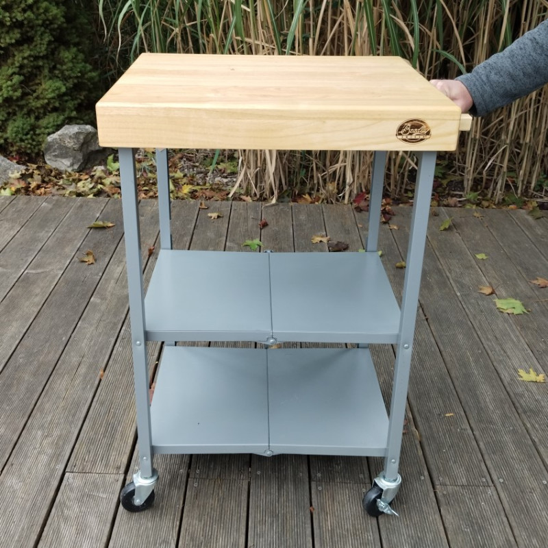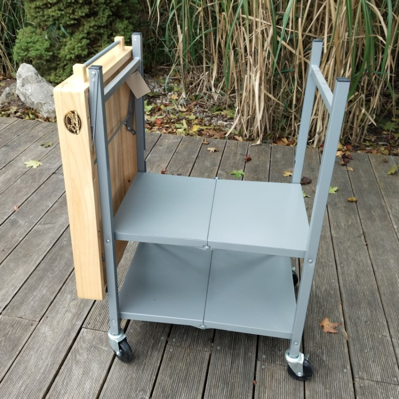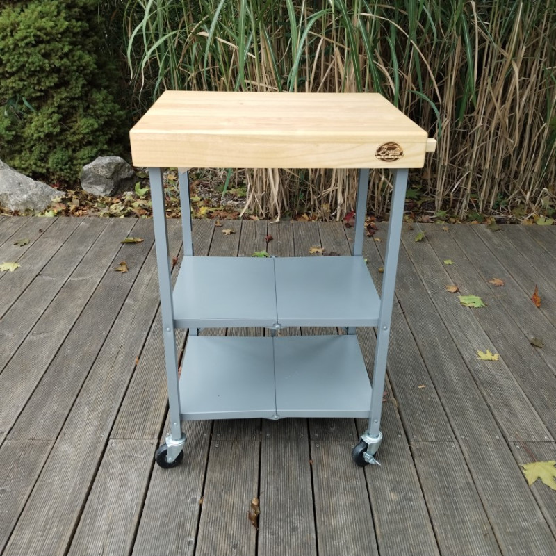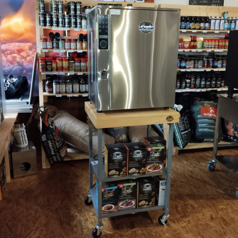 Pojazdný stôl z masívneho dreva pre všetky elektrické udiarne Bradley Smoker. Robustná konštrukcia, dve poistné kolieska a ideálna pracovná výška.
