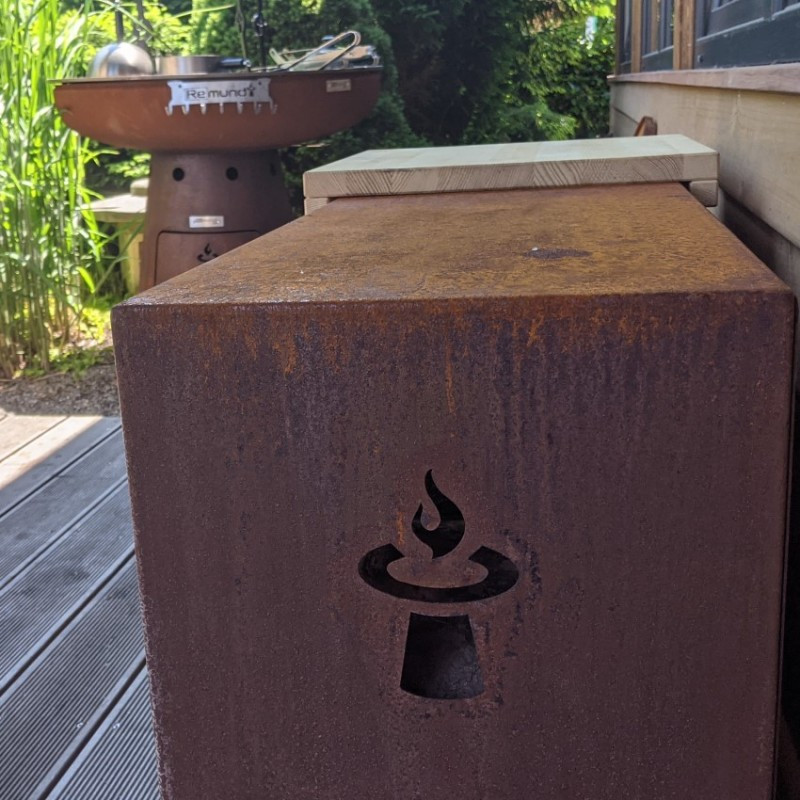 Drevník Remundi vyrobený z pevnej ocele odolnej proti poveternostným vplyvom dokonale pasuje ku grilovacím ohniskám Remundi. Ľubovoľné tvary a veľkosti drevníkov môžete skladať vedľa seba - fantázii sa medze nekladú.