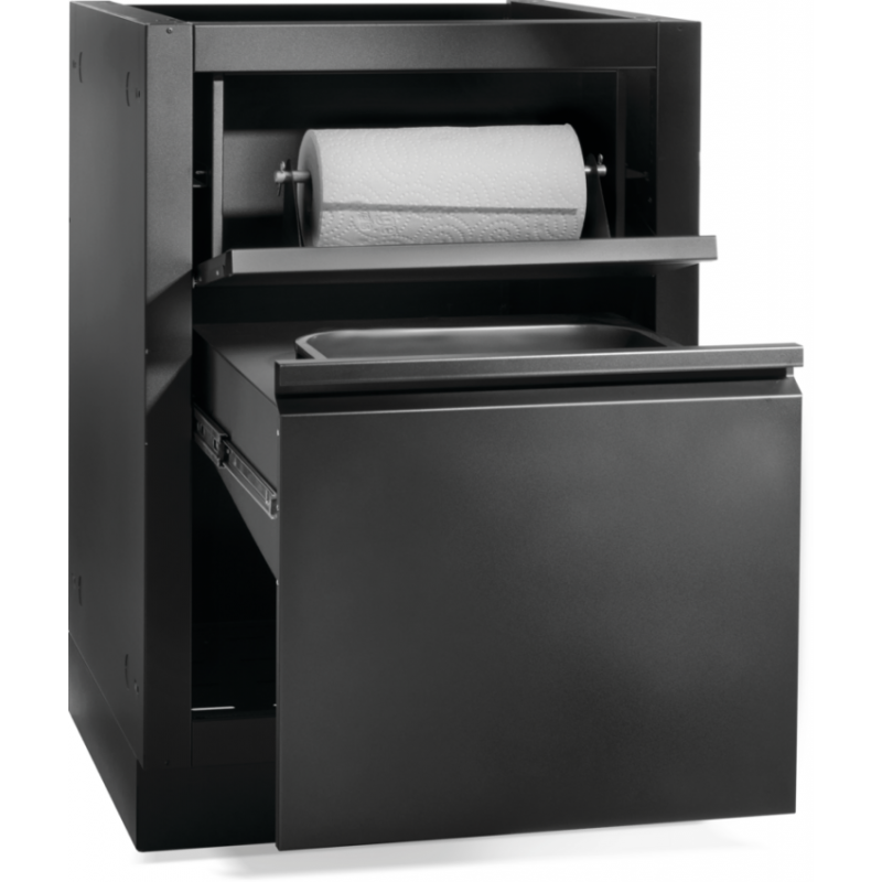 Skrinka vonkajšej kuchyne so zásuvkou na odpadkový kôš Napoleon Phantom je praktický modul pre zostavy OASIS™ so vstavaným grilom Napoleon. Matne čierne prevedenie Phantom zachováva jednotný a moderný vzhľad celej kuchyne. Konštrukcia z nehrdzavejúcej ocele s dvojvrstvovým smaltom zabezpečuje vysokú odolnosť voči poveternostným podmienkam a dlhú životnosť. Výsuvná zásuvka umožňuje pohodlné a hygienické riešenie odpadu priamo pri pracovnej ploche. Výklopný mechanizmus s držiakom na utierky zvyšuje komfort pri príprave jedál.