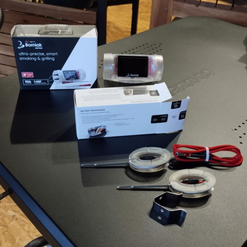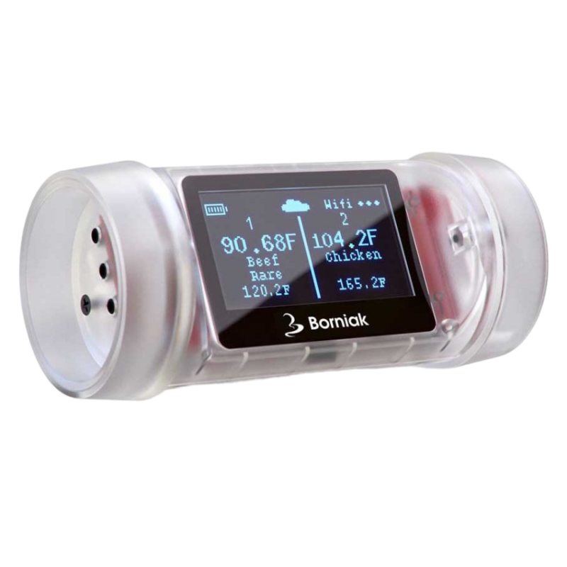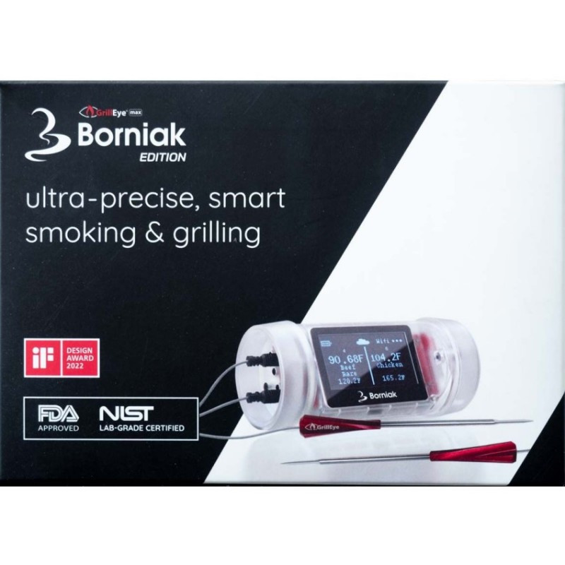 Teplomer Borniak GrillEye Edition je moderný digitálny teplomer určený na presné sledovanie vnútornej teploty mäsa počas grilovania, pečenia alebo údenia. Vďaka Bluetooth pripojeniu ho jednoducho prepojíte so smartfónom a priebeh prípravy sledujete pohodlne na diaľku. Presné meranie, inteligentné alarmy a prehľadná aplikácia robia z tohto teplomera spoľahlivého pomocníka pre každého nadšenca grilovania. Vhodný je do udiarne, grilu aj rúry.