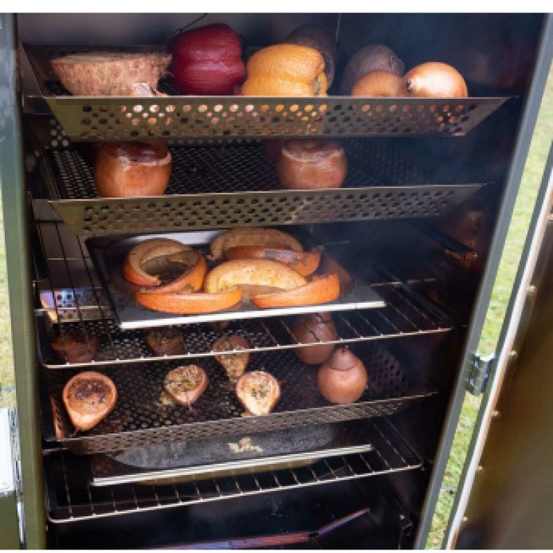 Vysoký údiaci kôš pre udiarne Borniak 150 je praktické rozšírenie, ktoré výrazne zvyšuje možnosti využitia vašej udiarne. Perforovaný nerezový rošt s vysokými bočnými stenami je ideálny na údenie menších potravín, ktoré by na klasickom rošte mohli prepadávať. Zabezpečuje rovnomerné prúdenie dymu aj teploty, vďaka čomu je údenie rýchlejšie a efektívnejšie. Skvelo sa hodí na zeleninu, kuracie mäso, morské plody aj syry.