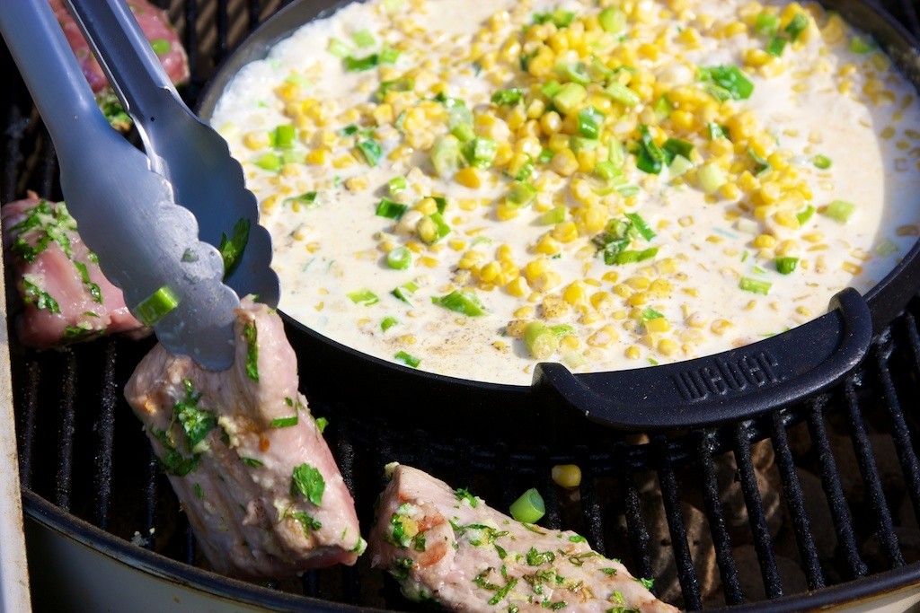 Postup: Bravčové panenky odblaníme a prekrojíme na 10 - 15 cm dlhé "kolíky". Z cesnaku, soli, oregana, olivového oleja a jablčného octu zmiešame pastu, ktorou panenky potrieme a necháme v chladničke 30 minút odležať. Grilujeme priamo na grilovacom rošte grilu. Občas skontrolujeme a otočíme. Opekáme do chvíle, keď sa panenka zatiahne a začne získavať typické hnedozlaté mriežky. Doprostred grilu umiestnime liatinovú panvicu s trochou oleja. Jarné cibuľky nasekáme nadrobno a nasypeme do panvice, chvíľu dusíme a pridáme zrnká kukurice. Osolíme a okoreníme, zalejeme smotanou. Varíme do chvíle než sa smotana zredukuje a kukurica v nej nepláva, je skôr smotanou obalená. Panenku servírujeme na teplej kukurici.